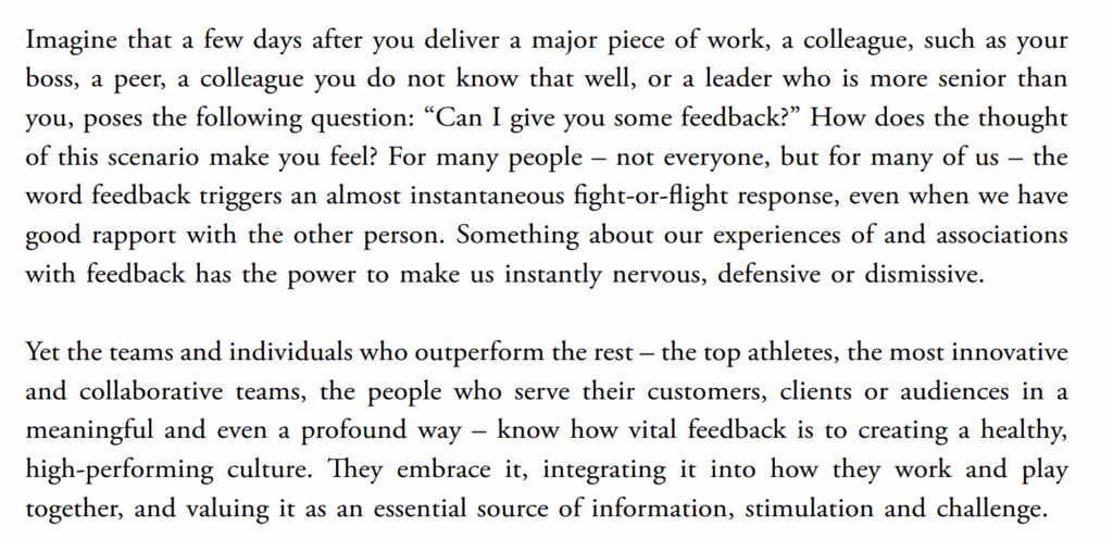 Tuy nhiên, những đội ngũ và cá nhân vượt trội so với đám đông – ví dụ như các vận động viên hàng đầu, các nhóm sáng tạo đổi mới và phối hợp với nhau tốt nhất, những người mang đến cho khách hàng, đối tác và khán giả của mình một dịch vụ có ý nghĩa và thậm chí tạo nhiều dấu ấn – biết rõ những ý kiến đánh giá có vai trò quan trọng thế nào để tạo ra văn hóa làm việc hiệu quả và lành mạnh. Họ đón nhận và tích hợp phản hồi vào cách họ làm việc và tương tác với nhau, và xem nó như một nguồn thông tin, cảm hứng và thử thách thiết yếu.